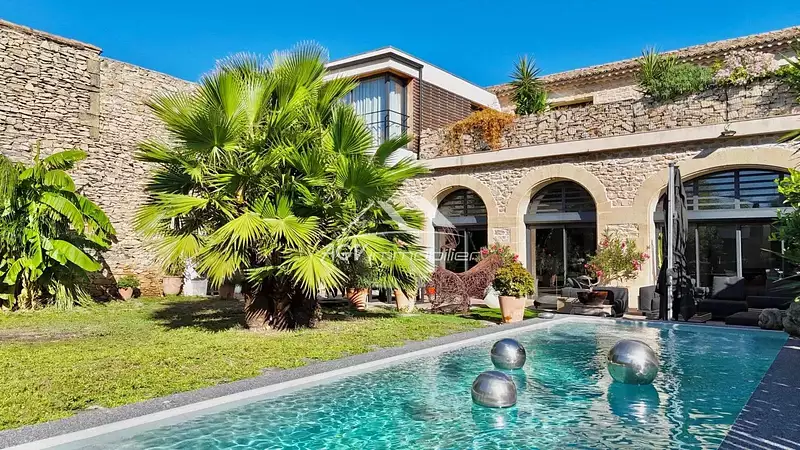 Au cœur d’Uchaud, à quelques minutes de Nîmes, cette ancienne cave viticole de 320 m² a été sublimée par une réhabilitation de prestige, alliant matériaux nobles et design contemporain.