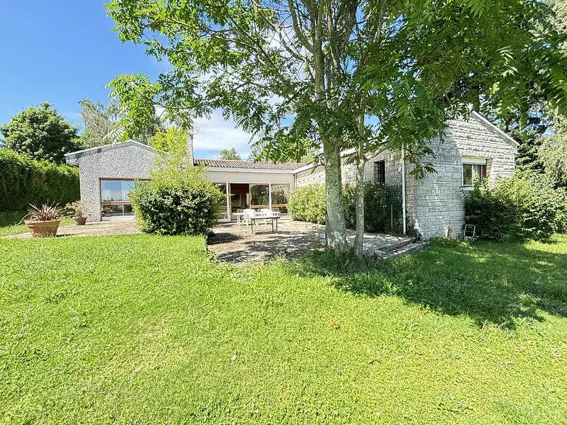 Idéalement située au cœur d'un magnifique jardin paysager, cette propriété d'exception de cinq chambres allie espace, luminosité et tranquillité, tout en étant à quelques minutes à pied du centre animé de Civray. Conçue par un architecte, elle se distingue par ses volumes généreux, ses matériaux haut de gamme et une distribution fluide des pièces, tant à l'intérieur qu'à l'extérieur. Caractéristiques Principales : Maison familiale de 5 chambres, signée par un architecte Espaces de vie spacieux et lumineux Finitions de qualité : façade en pierre de taille, sols en marbre et parquet raffiné Grand garage et allée privée avec portail Proximité immédiate des commerces, écoles et services Description Intérieure : Au rez-de-chaussée, vous serez accueilli par un vaste hall d'entrée menant à une pièce spectaculaire avec sol en ardoise, grande verrière et fontaine intérieure. Le salon, baigné de lumière grâce à de larges baies vitrées, donne accès à une terrasse surplombant le jardin et dispose d'une grande cheminée. La salle à manger attenante, élégamment parquetée, bénéficie elle aussi d'une ouverture sur l'extérieur. La cuisine familiale avec coin repas complète les espaces de vie. Côté nuit, cinq chambres doubles sont proposées, dont deux avec salle de bains privative. Une grande salle de bains familiale et deux WC indépendants complètent ce niveau. Potentiel Supplémentaire : Le sous-sol offre un vaste espace à aménager selon vos envies, sous réserve des autorisations nécessaires. Il se compose actuellement de trois pièces, d'une seconde cuisine, d'un WC, de deux celliers, d'une chaufferie et d'un très grand garage. Espaces Extérieurs : La maison est parfaitement implantée au centre de son terrain paysager, accessible par une allée privée avec portail. Le jardin, joliment arboré et fleuri, comprend deux grandes terrasses idéales pour les repas en plein air. Atouts Complémentaires : Raccordement au tout-à-l'égout Double vitrage Chauffage central Située dans un environnement paisible en lisière de Civray, cette propriété offre un cadre de vie agréable à proximité immédiate des commerces, restaurants, écoles et autres commodités. La ville de Poitiers et son aéroport avec liaisons directes vers le Royaume-Uni se trouvent à moins de 35 minutes. Une opportunité rare d'acquérir une propriété unique dans un emplacement privilégié. Les informations sur les risques auxquels ce bien est exposé sont disponibles sur le site Géorisques : www.georisques.gouv.fr »