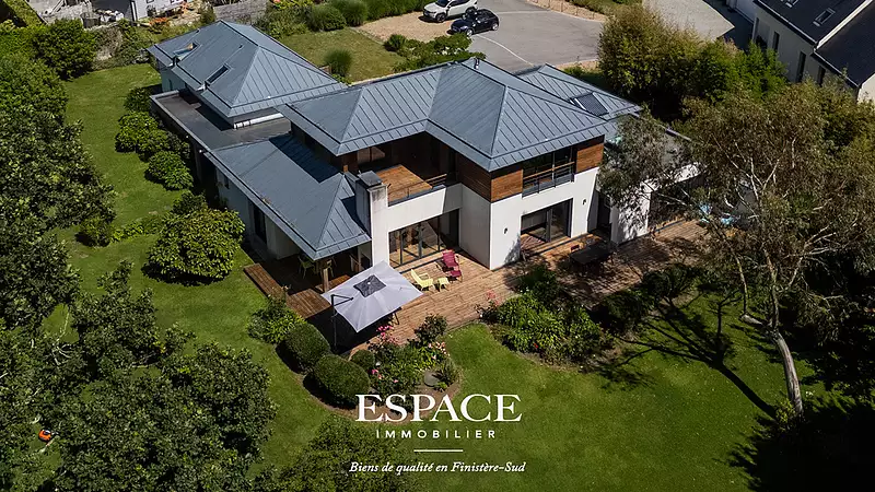 Trégunc aux portes de Concarneau, sublime maison d'architecte aux lignes audacieuses à seulement 2 kms des plages et des commerces, construite en 2009, offrant 327 m² habitables sur un terrain arboré de 2 665 m², au calme et sans vis-à-vis. Le rez-de-chaussée se compose d'une entrée d'un vaste salon-séjour lumineux avec poêle à bois, d'une cuisine ouverte avec arrière-cuisine, deux chambres dont une avec une suite parentale, dressing et salle d'eau, ainsi que d'un espace bien-être comprenant une salle de sport, un jacuzzi et une salle d'eau. A l'étage, vous trouverez deux autres chambres, un bureau, une salle d'eau et une terrasse pour profiter des extérieurs. Un T2 indépendant de 40 m² complète l'ensemble, idéal pour du locatif, une activité professionnelle, ou pour recevoir en toute autonomie. La maison est également équipée de panneaux solaires, alliant confort modernité et performance énergétique. Cuve de récupération d'eau de pluie enterrée de 10 000 l sur réseau secondaire. Un bien rare, spacieux et parfaitement situé, idéal pour une vie entre terre et mer. Pour visiter ou pour obtenir plus d'informations sur l'achat de cette maison contacter l' agence immobilière Espace Immobilier à Concarneau au 02.98.51.00.00 ou rejoignez-nous sur notre site internet Les informations sur les risques auxquels ce bien est exposé sont disponibles sur le site Géorisques [www.georisques.gouv.fr](http://www.georisques.gouv.fr). (3.60 % honoraires TTC à la charge de l'acquéreur.)