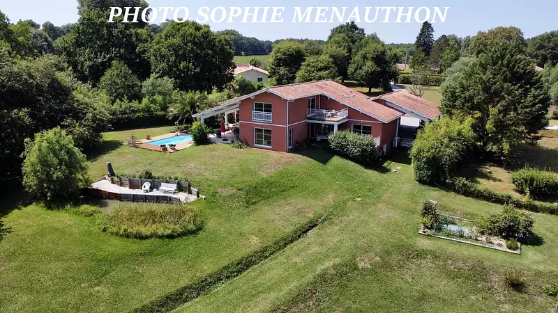 A découvrir au coeur d'un domaine DE 3 HECTARES doté d'un ETANG avec possibilité de construction supplémentaire, SUPERBE VILLA CONTEMPORAINE DE TYPE T8 DE 330 M2 AVEC PISCINE . Elle se compose d'un vaste hall d'entrée, pièce de vie de plus de 120 m2 cuisine entièrement aménagée et équipée donnant sur une terasse couverte, buanderie, cellier, 5 vastes chambres dont une suite parentale, 4 salles de bains, 3 wc, garage de 54 m2, sous sol de 50 m2 environ. BELLES PRESTATIONS à 10 KM des plages. Contactez Sophie MENAUTHON Tél : 06 25 42 67 68 ou Séverine ETCHEGARAY Tél : 06 75 49 61 04 EQUINOXES IMMOBILIER Agence specialisée en biens de Prestige Landes et Pays Basque Plus d'informations (réf. 4000924932) Prix TTC et Honoraires à charge vendeur TTC Les informations sur les risques auxquels ce bien est exposé sont disponibles sur le site Géorisques : georisques.gouv.fr