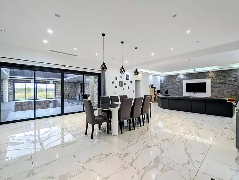 MONDAVEZAN (31220) - Environnement campagne pour cette MAISON CONTEMPORAINE récente de plain-pied aux vastes volumes et aux prestations haut-de-gamme, avec piscine intérieure sur terrain de 3000 m². La maison de 332 m² est composée d'un immense séjour de 105 m² avec cuisine américaine aménagée et équipée, un cellier de 14 m², un wc indépendant, 3 belles chambres avec placards de 22 m², 22 m² et 12 m², un grand dressing de 13 m² (ou 4ème chambre), 2 salles de douches avec wc de 16m² et 9,5 m². La PISCINE INTERIEURE, avec terrasse, verrière de toit et grandes baies à galandage, est la pièce centrale de la maison. Vaste sous-sol d'environ 120 m². Terrain de 3000 m² avec vue Pyrénées, garage indépendant de 64 m². Double système de chauffage : pompe à chaleur avec plancher chauffant et climatisation réversible gainable. Domotique, alarme, fibre optique. DPE : A (37kWh/m²/an) - GES : A (1kgCo²/m²/an) - Montant estimé des dépenses annuelles d'énergie pour un usage standard entre 970 euros et 1380 euros. Prix moyens des énergies indexés sur les années 2021, 2022, 2023 (abonnements compris) conformément à l'arrêté du 31 mars 2021 en vigueur lors de l'établissement du DPE.