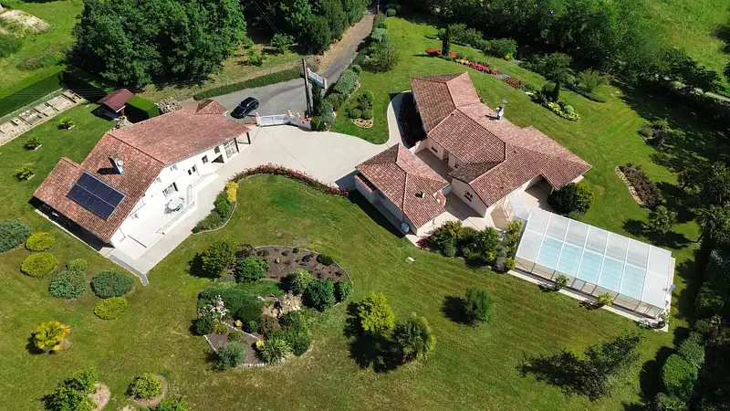 La résidence principale est dotée de 4 chambres, pièce de vie lumineuse, cuisine entièrement équipée, vaste bureau, garage indépendant, piscine avec dôme le tout au sein d'un magnifique jardin de 11 000m2 entièrement clos.