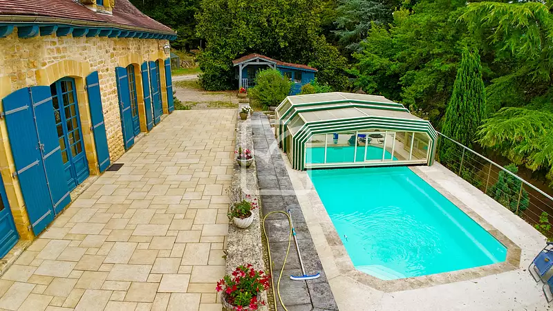 Un cadre rare et raffiné :Terrain plat et paysagé de 23 750 m2, avec bois et clairièresPiscine couverte et chauffée, idéale en toute saisonPlusieurs dépendances : chalets bois, atelier, buanderie, double garage, double carportFour à pain traditionnel, empreinte du patrimoine localVue panoramique exceptionnelle sur la vallée de la Dordogne et sur la cité médiévale de Domme