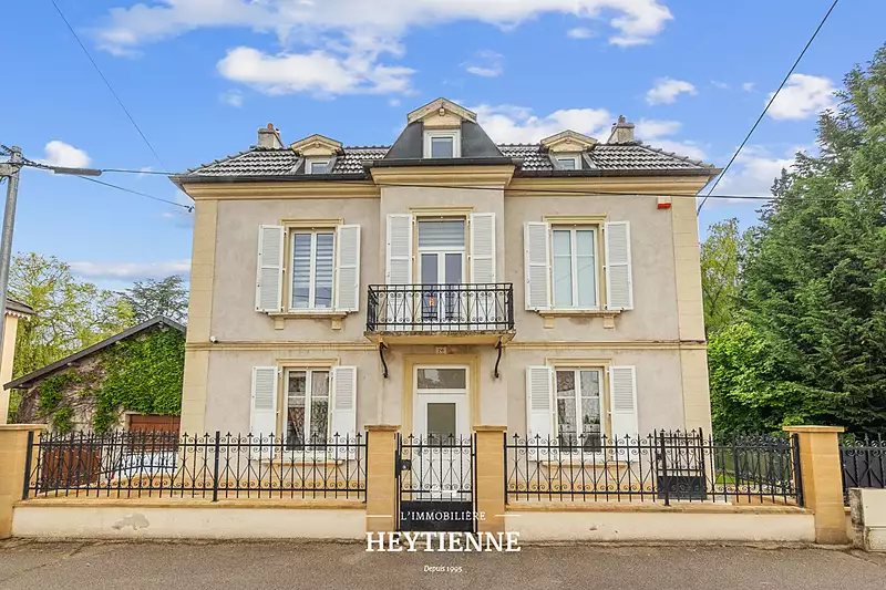 Courcelles-Chaussy. 10 minutes, hôpitaux, technopôle, actipôle, zone commerciale. Rare, superbe maison bourgeoise du début du XX siècles de 340m2 sur 2239m2 de terrain en superbe état général. Au rez de chaussée, une entrée distribue: un séjour, une salle à manger, un salon, une cuisine meublée équipée avec un accès dans une très belle veranda donnant sur une terrasse avec vue sur le jardin de la propriété. Au 1er étage, trois grandes chambres, et une salle de bains. Au dernier étage, une suite parentale avec une chambre, un dressing, une salle d'eau. Au rez de de jardin, une chambre avec salle d'eau. Le sous sol , :une buanderie, un cellier, une chaufferie. Chauffage gaz individuel, alarme, dépendances, parkings fermés, jardins clos. A découvrir. Nous consulter Alain VINCENT 06 08 60 13 17 L'Immobilière Heytienne Alain VINCENT (EI) Agent Commercial - Numéro RSAC : - .