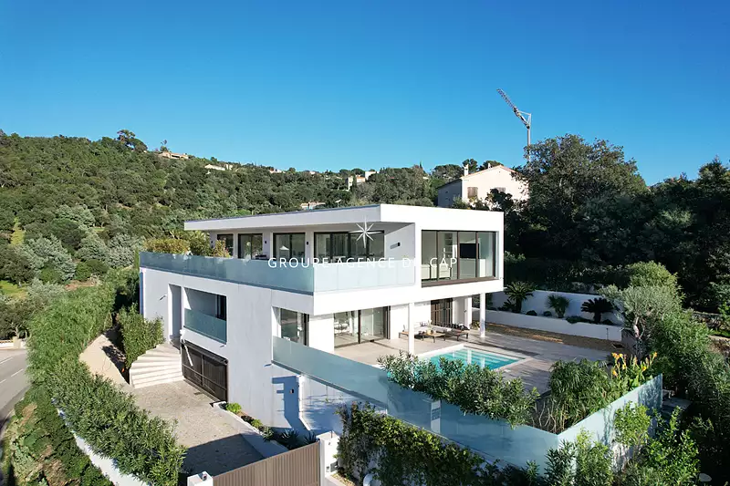 A vendre : superbe maison contemporaine de 330 m², construite en 2022, avec une vue imprenable sur la mer et une exposition sud-ouest pour un ensoleillement idéal. Elle dispose d'un garage de 150 m² pouvant accueillir jusqu'à 6 voitures. Le rez-de-chaussée propose 3 chambres en suite, une salle de sport avec douche (pouvant servir de chambre supplémentaire) et un bureau. A l'étage, un grand séjour avec cuisine ouverte de 75 m² donne sur une terrasse de 120 m² avec vue mer. Une pièce jacuzzi, des toilettes invités et un grand bureau complètent ce niveau. A l'extérieur, un magnifique jardin paysagé avec piscine et arrosage automatique invite à la détente. La maison est également équipée de climatisation gainable, d'un vide sanitaire de 80 cm et d'un ascenseur pour un confort optimal.