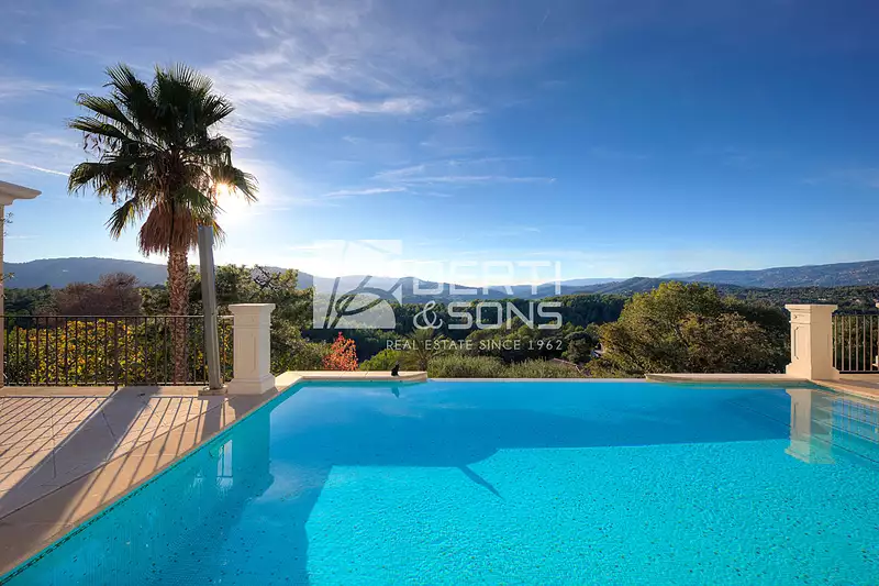 Le Groupe Immobilier Berti et Sons vous propose à la vente en exclusivité cette magnifique villa, à seulement 10 minutes de Cannes, située à Mouans-Sartoux dans un quartier calme et résidentiel. D'une superficie de 340 m² et implantée sur un terrain de 1 502 m², cette propriété aux prestations haut de gamme offre de vastes espaces de vie ainsi qu'une vue dégagée sur les montagnes du Tanneron. Elle est composée comme suit : Au rez-de-chaussée, une superbe suite parentale avec un dressing, une salle de bain comprenant une baignoire et une douche ainsi qu'un WC indépendant. L'espace de vie principal se compose d'une belle cuisine ouverte entièrement équipée, donnant sur un vaste séjour et salle à manger. Un coin salon avec cheminée complète cet espace chaleureux. Le sol est habillé d'une élégante pierre italienne Botticino, apportant un cachet unique à l'ensemble. Un WC invité est également présent à ce niveau. Au niveau du séjour on retrouve une superbe piscine chauffée à débordement ainsi qu'un pool house. Au rez-de-jardin, une très grande salle de jeux / salle cinéma d'environ 50 m². Ce niveau comprend également une suite avec salle d'eau et WC, ainsi que deux chambres supplémentaires qui se partagent une salle d'eau et un WC indépendant. Une buanderie / espace technique ainsi qu'une cave complètent ce niveau. Côté extérieur, la maison bénéficie d'une arrivée de plain-pied avec de nombreux espaces de stationnement ainsi qu'un garage attenant d'environ 20m² ! Un bien rare à découvrir sans tarder ! Contactez-nous dès maintenant pour plus d'informations ou pour organiser une visite. (4.74 % honoraires TTC à la charge de l'acquéreur.)