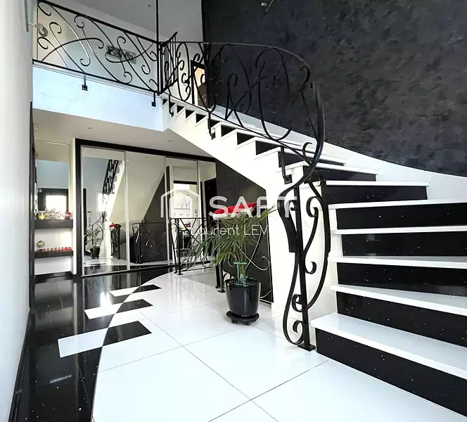 Découvrez cette somptueuse maison en pierre de taille et toiture en tuiles, de 340 utile (147 m2 habitable) sur un terrain de 539 m2, avec vue plongeante sur le Golf. Située au calme, cette maison de 7 pièces dont 5 chambres se compose d'une entrée spacieuse, d'un magnifique espace double séjour + cuisine US équipée de 65 m2. Le séjour est prolongé par une terrasse de 40 m2 exposée sud, bordant le superbe golf arboré. A ce niveau vous trouverez une chambre, une salle d'eau avec wc, le garage pour 2 voitures (carrelé, isolé, chauffé). A l'étage, vous profiterez de 4 autres chambres, d'une mezzanine, d'une sdb (baignoire balnéo), d'un wc, d'un accès à des combles isolés. La maison dispose d'une cave entièrement aménagée, équipée, carrelée, chauffée comprenant une salle de jeux, la buanderie, une cave à vin, une cave de rangement. Les prestations (équipements, matériaux) sont luxueuses. Stores électriques, alarme, sol chauffant, pompe à chaleur, récup. d'eau de pluie, arrosage automatique