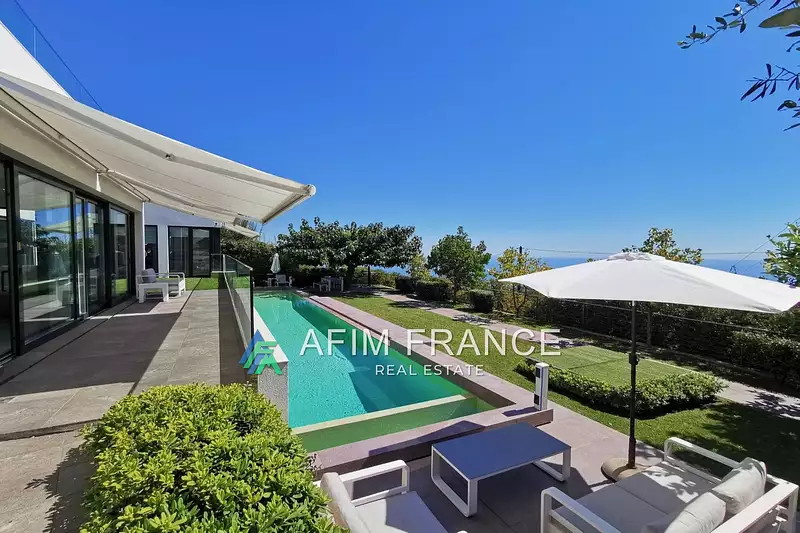 Superbe Villa moderne avec piscine, 350 m² habitables sur un terrain de 1515 m², un grand séjour avec cheminée, un salon tv, un espace bureau, une cuisine séparée, 4 chambres, 4 salles d'eau et une buanderie. Une salle de sport et un sauna. Vue mer et Monaco. Un garage fermé 2 voitures + plusieurs parkings extérieurs. Climatisation réversible dans toutes les pièces de la villa et alarme.