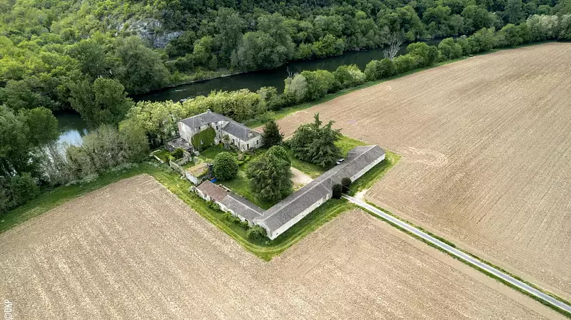 Vallée du lot Ouest,en campagne isolée, proche rivière, ancienne ferme (11ème et 13ème siècles) avec dépendances et 29ha de terres agricoles attenantes. La maison (sur 5 caves voutées) et terrasse de 80m², est composée d'une partie habitable d'environ 115m² (5 pièces, salle d'eau, wc, chauffage au fioul) et d'environ 230m² (10 pièces dont 3 au 2ème étage) à restaurer (fenêtres, électricité, isolation, plomberie, assainissement, etc.). Eléments d'architecture : escalier à vis en pierre, plafonds à la française, cheminées. Dépendances : hangar de 450m² - Atelier de 40m² avec pièce voutée de 20m² - Cochonnier 55m² + ancien poulailler - Ancienne chapelle voutée 35m² - Cave voutée 56m² + 15m².