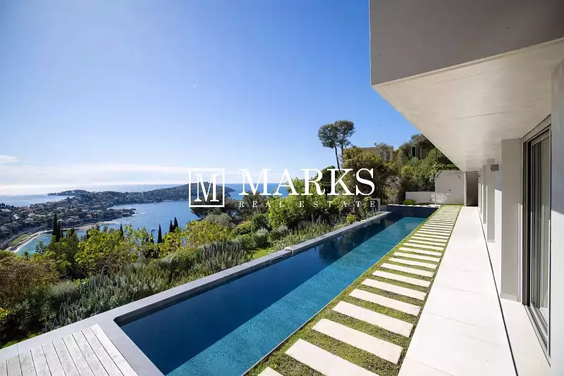 Superbe villa d’architecte avec magnifique vue sur la rade de Villefranche et le Cap Ferrat, au sein d’un domaine privé sécurisé.