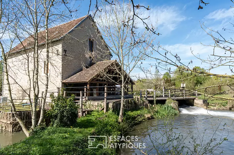 Situé au coeur de la Sarthe, ce moulin du XIIe siècle, entièrement fonctionnel, offre un cadre de vie rare et préservé. Implanté sur un terrain de plus de 2 500 m², il comprend une maison principale, deux gîtes indépendants et un moulin historique de 140 m² bénéficiant d'un droit d'eau, permettant une production hydraulique par roue à aube. Un lieu chargé d'histoire, entre patrimoine et modernité, où la nature et l'eau rythment le quotidien. L'ensemble développe une superficie d'environ 350 m² et propose de multiples possibilités : résidence principale ou secondaire, activité d'hébergement avec chambres d'hôtes et gîtes équipés, ou encore projet d'aménagement du moulin pour en faire un espace de vie unique. L'exposition idéale et la vue dégagée sur la nature subliment ce bien singulier. L'intérieur de la maison principale séduit par ses volumes généreux et sa luminosité. Son séjour chaleureux, avec cheminée, s'ouvre sur une grande pièce conviviale. La suite parentale bénéficie d'une vue imprenable sur le moulin et l'écluse, offrant un réveil au fil de l'eau. Les gîtes, entièrement équipés, permettent d'accueillir famille, amis ou voyageurs en quête d'authenticité. L'extérieur est un véritable écrin de nature. Deux îles bordent l'écluse, créant une atmosphère bucolique et préservée. Le jardin offre de magnifiques espaces pour se détendre et profiter du cadre verdoyant. L'ensemble du domaine constitue un havre de paix où la nature est omniprésente. Situé à moins de 25 minutes du Mans et à peine à 2 heures du centre de l'Île-de-France, le bien profite d'un environnement calme, tout en restant proche des commodités et des axes principaux. Classe Energie C / Classe climat A Montant moyen annuel de consommation d'énergie, calculée sur une consommation standard : entre 3 070 euros et 4 200 euros Contact (EI) : Romane BLIN au 06.87.61.30.66 Agent commercial immatriculé au RSAC du Mans sous le n° 939 119 145 Les honoraires sont à la charge du vendeur. Les risques auxquels ce bien est exposé sont disponibles sur le site Géorisques pour la zone concernée : www.georisques.gouv.fr