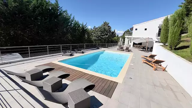 AJA IMMOBILIER vous propose cette exceptionnelle et lumineuse villa individuelle 7 pièces de 353 m2 sur 3000 m2 de terrain plat. 5 chambres avec dressing et salle d'eau. Appartement 2 pièces indépendant de 40 m2. Combles aménageables. Terrasses, balcons, jardin, piscine, terrain de pétanque, grand garage de 85 m2 + parkings extérieurs. Belles prestations. UN PRODUIT RARE SUR LE MARCHE.