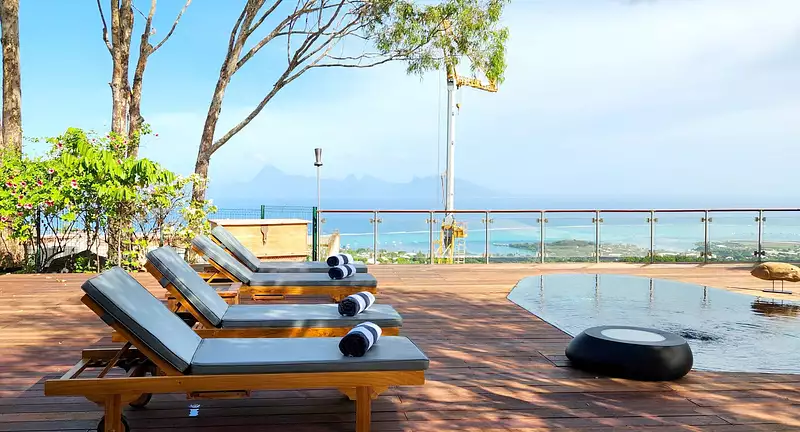 À l'extérieur, un immense deck en bois exotique s'avance vers l'horizon, où une piscine à débordement en forme de coeur vous invite à vous immerger dans la fraîcheur tout en contemplant Moorea. Le vaste jardin paysager est un sanctuaire idéal pour se détendre ou profiter d'une soirée étoilée.