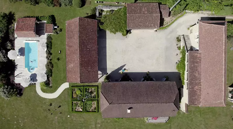 L'ancienne orangeraie abrite un salon d'été ouvert sur les extérieurs. Une halle couverte offre un lieu de vie extérieur polyvalent : espace repas ombragé, espace ludique, ou bien organisation de réceptions.