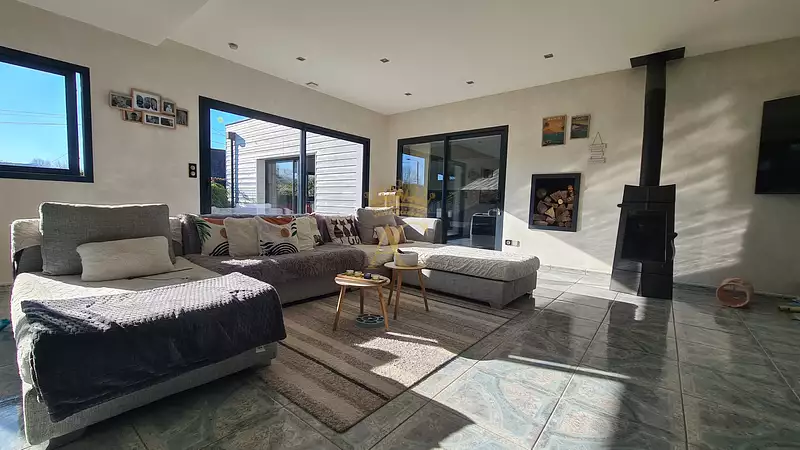 Les extérieurs sont tout aussi agréables avec une terrasse couverte, une autre terrasse de 30 m2 exposée sud-ouest, un carport pour deux voitures et une allée goudronnée. Un portail électrique et un système d'alarme assurent votre sécurité. Toutes les menuiseries sont en oscillo-battant, et la maison bénéficie d'une VMC double flux ainsi que d'un adoucisseur d'eau pour un confort optimal.