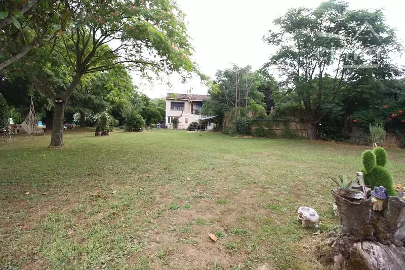Le terrain est aménagé en plusieurs espaces : un espace détente, un potager, des arbres fruitiers, et un espace laissé naturel.
