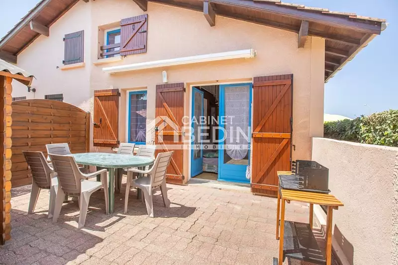 donnant directement sur une grande terrasse dallée exposée est. La maison dispose d’une chambre en rez-de-chaussée, d’une mezzanine offrant un bel espace nuit supplémentaire, d’un dégagement, d’une salle d’eau fonctionnelle et de WC séparés. Vous apprécierez également le cabanon bois pratique pour ranger le mobilier de jardin et le barbecue déjà présent. L’ensemble est bien entretenu, dans une résidence calme et agréable, à deux pas de l’océan et des commerces accessibles à pied, volets bois traditionnels et poutres apparentes qui donnent tout son cachet à ce bien.