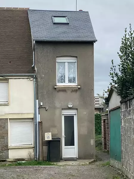 En centre-ville de FLERS, en retrait de la circulation, maison de type F2 comprenant séjour, cuisine aménagée ouvrant sur courette . A l'étage: chambre et SDE. Grenier au-dessus.
