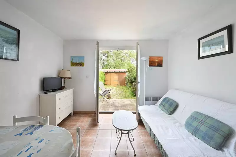 Immobilier Ile de Ré - Ars en Ré - Maison proche de la plage vendue meublée. Elle se compose d'une pièce de vie avec des wc en rez-de-chaussée. A l'étage vous trouverez deux chambres avec une salle de bain. Un jardin plein sud et une place de parking complètent ce bien avec un accès à une grande piscine commune. Excellent rapport locatif !