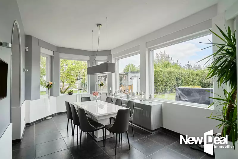 Vous trouverez une salle à manger de 26 m2 avec ce Bow Windows, une cuisine ouverte et bien équipée de 17 m2, une arrière cuisine y est attenant et un salon de 53m2 pouvant offrir un espace détente et/ou repas très lumineux.