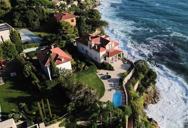 Cette propriété unique, située sur un terrain en bord de mer, offre une vue incroyable sur la mer Méditerranée et un cadre de vie de rêve. La maison principale, d’environ 280 m², se compose au rez de chaussée d’un vaste séjour lumineux avec vue sur la mer, d'une cuisine indépendante, d'une chambre avec salle de bains, et d’un bureau. À l’étage, on trouve cinq chambres et salles d'eaux.