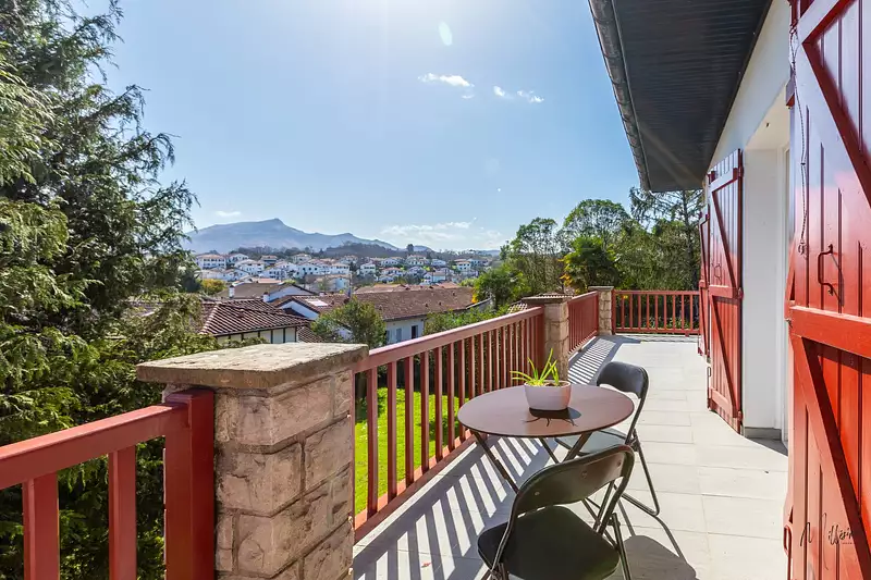 Superbe vue montagnes pour cette ravissante maison néo-basque avec garage posée sur une parcelle piscinable de 1247m2 idéalement située sur la colline de Bordagain, à quelques pas du bourg et du port.