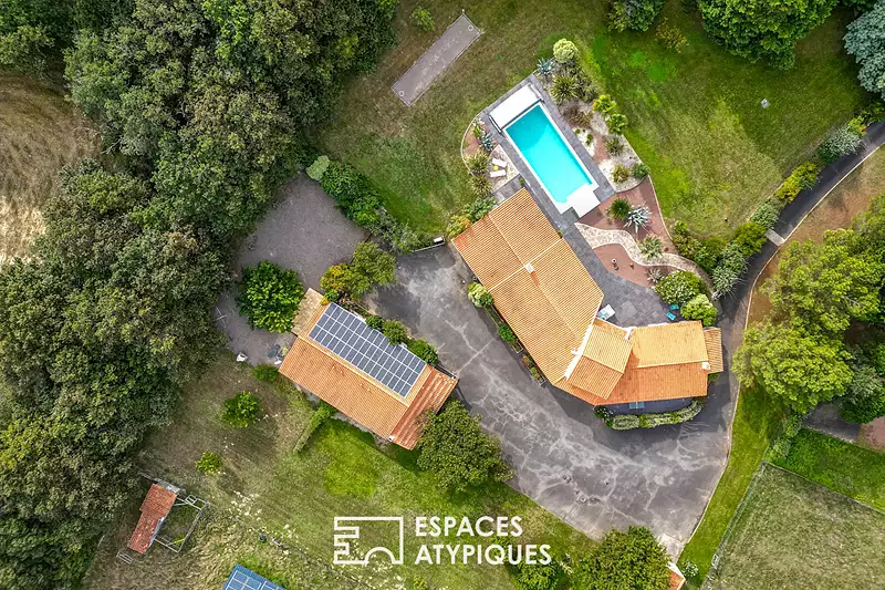 Au détour d'une impasse discrète dans un domaine arboré, à quelques minutes des plages des Sables d'Olonne, cette propriété d'exception se niche dans un écrin de verdure d'un hectare. Pensée pour les amoureux de sérénité et de grands espaces, elle conjugue architecture raffinée et nature préservée. Dès l'entrée, les volumes généreux de la maison principale de 270 m² s'ouvrent sur le parc paysagé, offrant une harmonie parfaite entre intérieur et extérieur. Le séjour aux larges ouvertures, capte la lumière. Un espace lecture propice à la détente, prolonge cette atmosphère feutrée, tandis que la cuisine semi-ouverte, entièrement équipée, accompagne les instants de convivialité. L'aile parentale se veut un véritable sanctuaire, avec son dressing sur-mesure et sa chambre élégante, prolongée par une salle d'eau raffinée. Une seconde chambre peut compléter ce niveau. A l'étage, une chambre avec sa propre salle de bain offre un espace intime et apaisant. A l'écart de la maison principale, une dépendance de 140 m² aux volumes généreux laisse place à de nombreuses opportunités. Aménagée en espaces de travail et en appartement indépendant, elle se prête aussi bien à un projet professionnel qu'à un lieu dédié à l'accueil. Son salon lumineux s'ouvre sur une terrasse ombragée, parfaite pour savourer les longues soirées estivales. Au coeur du parc paysagé, palmiers, cactus et essences méditerranéennes sculptent le décor d'un jardin hors du temps. Une piscine aux lignes élégantes s'intègre parfaitement à ce cadre enchanteur, offrant un refuge idéal pour les journées ensoleillées. Un sauna et un double garage viennent parfaire les prestations haut de gamme de ce lieu unique. A 8 minutes des commerces et 10 minutes des plages, cette propriété rare offre un cadre de vie exclusif, où chaque jour prend des allures de vacances. CLASSE ÉNERGIE : C - CLASSE CLIMAT : A Montant moyen estimé des dépenses annuelles d'énergie pour un usage standard, établi à partir des prix de l'énergie de l'année 2021 : entre 4337 et 5800 euros Contact (EI) : Nathalie Fayat 07 86 61 96 35 Agent commercial immatriculé au RSAC de LA ROCHE-SUR-YON sous le numéro 2020AC00187. Les honoraires sont à la charge vendeur. Les informations sur les risques auxquels ce bien est exposé sont disponibles sur le site Géorisques : www.georisques.gouv.fr Nathalie FAYAT (EI) Agent Commercial - Numéro RSAC : 887 946 424 - LA ROCHE SUR YON.