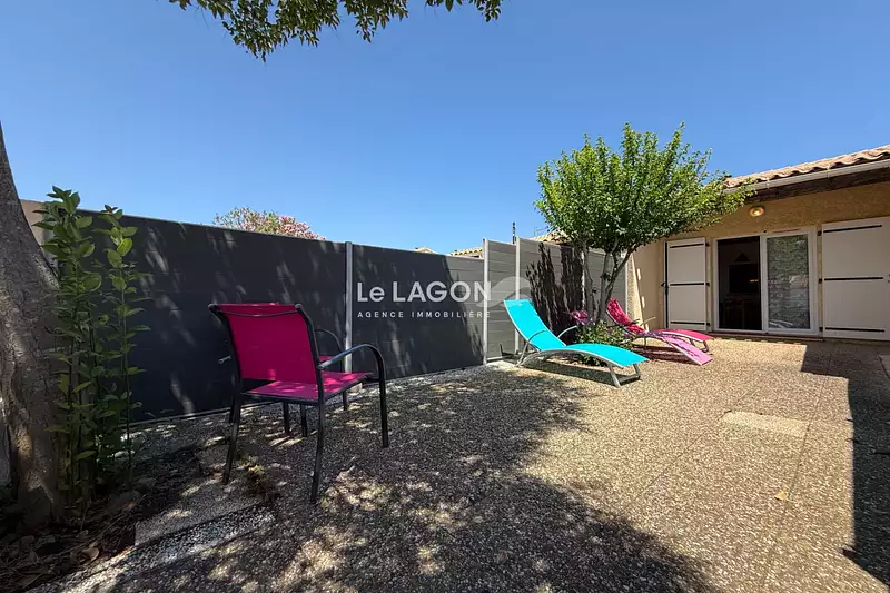 Dans une petite copropriété ouverte très agréable : maison meublée traversante d'une superficie d'environ 44m² particulièrement ensoleillée, comprenant au rdc : une entrée sur un séjour-salon avec coin cuisine équipée, une chambre avec un grand placard aménagé ouverte sur la terrasse arrière, une salle d'eau, un wc indépendant.