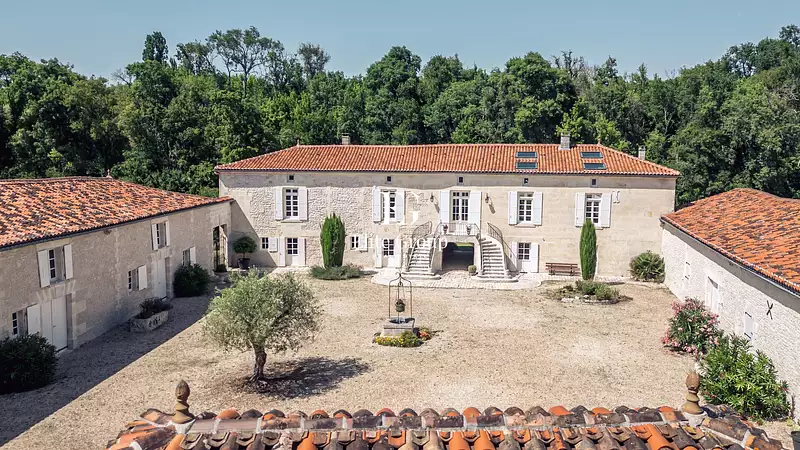 ELITE GROUP Real Estate a le plaisir de vous présenter ce beau Logis Charentais du XVIIIe siècle, entièrement restauré, situé entre Cognac et Angoulême, dans un environnement calme et verdoyant en bord de Charente. La propriété développe environ 500 m² habitables sur trois niveaux, desservis par un ascenseur, et offre un cadre de vie confortable et raffiné. Les espaces sont généreux, lumineux, et la rénovation a su préserver le charme de l'ancien tout en apportant des prestations actuelles. Le rez-de-chaussée accueille une grande salle de réception, une cuisine d'été, une cave, une buanderie et une chaufferie. A l'étage, on découvre une entrée traversante, un salon-séjour lumineux avec cheminée en pierre, une vaste cuisine aménagée et équipée, ainsi qu'une belle bibliothèque. Le second niveau comprend trois chambres, chacune avec salle d'eau et WC, ainsi qu'une mezzanine avec bureau. Un gîte indépendant de 60 m², situé dans l'ancienne maison de gardien, complète cet ensemble. Il se compose d'un séjour avec cuisine équipée, d'une chambre, d'une salle d'eau et d'un four à pain conservé en l'état, idéal pour accueillir famille, amis ou voyageurs. Les dépendances totalisent plus de 900 m² au sol. En très bon état, elles offrent de nombreuses possibilités d'aménagement selon vos envies ou projets : espaces de vie supplémentaires, lieux de réception, ateliers ou activités touristiques. A l'extérieur, le terrain de 7 320 m² est soigneusement paysagé. Il comprend plusieurs terrasses, une pergola bioclimatique, une orangerie, une piscine avec nage à contre-courant, et un accès direct à la Charente, qui longe paisiblement la propriété. La situation est idéale : à seulement 4 km de Jarnac, 10 minutes de Cognac et 25 minutes d'Angoulême (gare TGV), vous bénéficiez d'un cadre de vie privilégié, sans être isolé. Les visites de ce bien se feront sur dossier, afin d'assurer un accompagnement personnalisé. Des visuels complémentaires sont disponibles sur demande, après présentation de votre projet. Une propriété pleine de charme, à découvrir en toute confidentialité. (6.00 % honoraires TTC à la charge de l'acquéreur.)