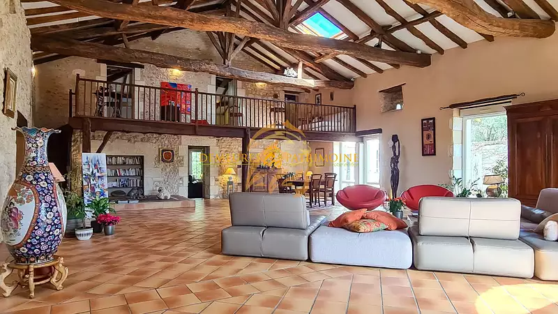 Au rez de chaussée, une entrée s'ouvre sur un vaste salon lumineux d'environ 125 m², sublimé par sa charpente traditionnelle. La cuisine, très spacieuse et entièrement aménagée, prolonge la convivialité vers une terrasse ombragée.