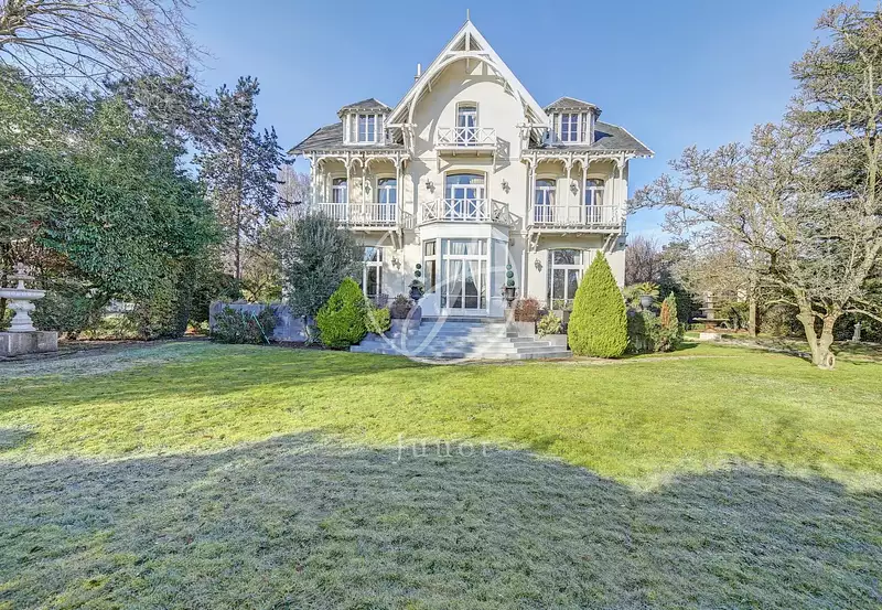 Cette prestigieuse demeure datant de la fin du XIXe siècle a été entièrement rénovée entre 2010 et 2012, la toiture et les boiseries rénovées fin 2025, elle allie le charme de l’architecture anglo-normande à des prestations modernes. Offrant une surface habitable de 420m² (et 540m² utiles), elle se compose de onze pièces principales, dont cinq à six chambres, et se déploie sur un terrain paysager discret et arboré de 1819m². La propriété bénéficie également d’un accès privatif à la promenade des berges de la Seine.