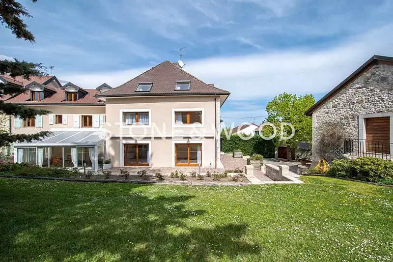 Dans une bâtisse datant de 1900, spacieuse maison mitoyenne de charme et de caractère d'environ 350 m2 habitables sur 3 niveaux entièrement rénovée avec des matériaux haut de gamme. Parcelle arborée de 1100 m2 protégée du vis-à-vis.