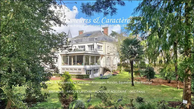 Maison Bourgeoise de 1882 sur parc remarquable de 3 768 m2 au cœur d’une bourgade toutes commodités et au bord de l’Erdre (accès privatif et mise à l’eau), 35mn NANTES, 40mn ANGERS. Cette luxueuse Demeure de 420 m2 habitables (+ 184 m2 de surfaces utiles + dépendances) offre un grand confort, de belles hauteurs sous plafond, des matériaux de qualité, divers éléments d’époque et de superbes vues sur son parc et le clocher de la commune. La maison, qui a bénéficié d’une extension soignée dans les années 1950, se trouve très bien équipée et en excellent état général. Conviendrait idéalement pour résidence principale ou secondaire, résidence d’artiste, accueil en chambres d’hôtes haut de gamme, table d’hôte, petite réception et toutes activités à réaliser dans un cadre intime et de standing. Composition du bâtiment principal : Sous-sol intégral en diverses pièces de service et rangement, lingerie, cave à vin, réserve, sanitaires et pièce de réception avec bar ouvrant sur terrasse en rez-de-jardin et parc. Au Rez-de-chaussée : Hall d’entrée, vestiaires et sanitaires, bureau, salle de billard et salon en enfilade avec portes à galandage, séjour - salle à manger avec coin cheminée (foyer fermé) et impressionnante verrière vue sur le parc, diverses entrées de service, office avec rangements, cuisine AE avec espace repas. Très bel escalier de marbre, agrémenté d’un vitrail illuminé, menant aux étages. Au premier étage : Grand palier avec penderies et nombreux rangements, 4 grandes chambres (dont une suite avec antichambre et grande terrasse) disposant chacune d’une salle de bain ou salle de douche et WC. Au deuxième étage : Deux chambres (dont une avec salle de douche et WC et l’autre avec nombreux rangements), grande pièce (possible chambre, salle de jeux, bureau, ...). Entretien intérieur et extérieur suivi ; Huisseries bois et alu double vitrage (+ verre 44.2 en partie) ; Volets intérieurs + traditionnels et roulants ; Plancher chauffant en principal ; Cuisine et lingerie équipées ; Sonnette de service ; Assainissement communal ; Excellente exposition de la maison et ses terrasses ; Propriété close avec portail commandé et système de protection électronique + télésurveillance, ... Dépendances dont grand garage fermé, grenier au-dessus, serre, constructions d’agrément et divers... Parc / jardin clos aux arbres remarquables et séculaires pour certains, essences variées, paysagements, nombreux arbustes à fleurs, bassin d’ornement, espace potager, accès privé à l’Erdre avec escalier de mise à l’eau, parking extérieur sécurisé. Ecoles, collège, restaurants, cinéma et toutes commodités à pied. Réseaux 4G, ADSL et fibre haut débit disponibles. Taxe foncière : 1845 €. Dossier complet et rendez-vous de visite sur demande référencée. Ce bien vous est présenté par l'Agence DEMEURES & CARACTÈRE® - Cabinet Retz-Immobilier, spécialiste de l'immobilier de Caractère, Atypique, Rural, Équestre, d'Exception & de Prestige. Estimation, Valorisation commerciale, Vente-Achat, Conseil et Accompagnement jusqu'à la réalisation de la transaction, prise de vue photographique aérienne par drone (professionnel agréé DGAC). Les annonces du Cabinet bénéficient d'une visibilité nationale et internationale. L'agence DEMEURES & CARACTÈRE ® officie dans les régions BRETAGNE, PAYS DE LA LOIRE, NOUVELLE AQUITAINE et OCCITANIE. Les témoignages de nos vendeurs et acquéreurs sont à votre disposition sur la page d’accueil du site internet du Cabinet. Contact : Chris DUBOIS. Mandat exclusif de vente @MNNRICD - no218878 - 110907. - Annonce rédigée et publiée par un Agent Mandataire -