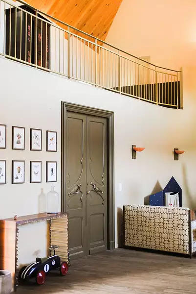 À l'étage : mezzanine « passerelle », trois chambres, salle de bains (baignoire & douche), terrasse