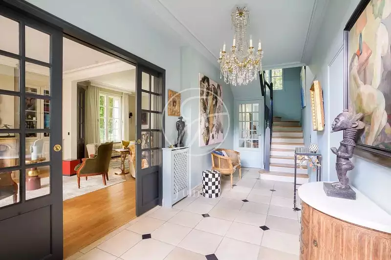 Nichée dans un cadre verdoyant, cette somptueuse demeure datant du début du XXe siècle offre 360m2 de raffinement sur une belle parcelle paysagée de 2 176m². Entièrement rénovée en 2023 avec des matériaux haut de gamme, elle allie le charme de l'ancien au confort moderne. Dès l’entrée, vous serez séduit par la remarquable hauteur sous plafond qui confère une impression d’espace et de grandeur. La pièce de vie se distingue par ses élégantes moulures, ses magnifiques parquets d’époque et sa cheminée d’ornement. Elle s’ouvre sur un somptueux jardin d’hiver. De l’autre côté, une cuisine dînatoire spacieuse et conviviale, sublimée par ses verrières, allie esthétisme et fonctionnalité.