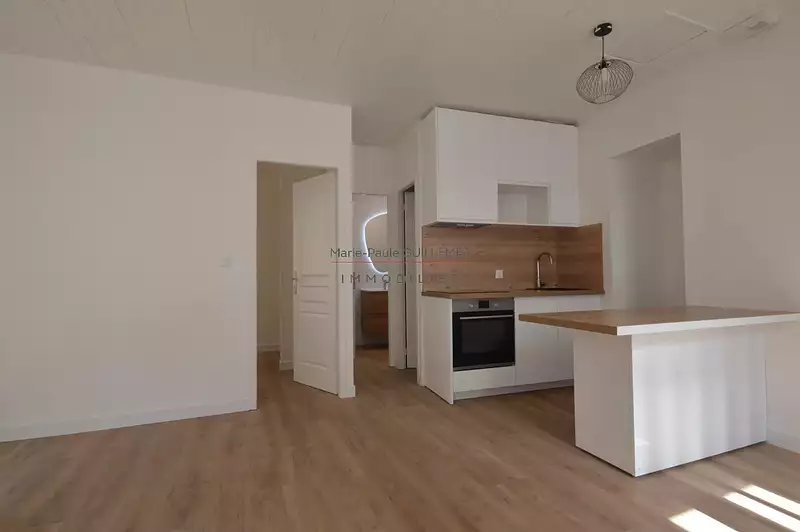 Cuisine aménagée neuve, pièces lumineuses, toilettes séparés, volets sur grandes fenêtres.
