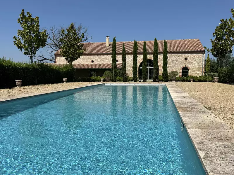 Nichée entre les charmantes villes de Condom, Lectoure et Agen, cette magnifique propriété en pierre, ancien chai entièrement rénové en 2021 par une entreprise de renom, offre 445 m² habitables au coeur d'un jardin paysager d'un hectare. Derrière le portail en fer forgé, une allée blanche vous conduit jusqu'à la bâtisse principale. Dès l'entrée traversante, la vue s'ouvre sur le jardin et la piscine, agrémentée d'une élégante fontaine en arrière-plan.