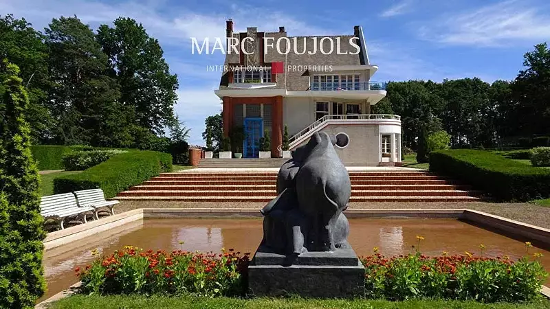 De style ART DECO cette demeure n'a connu qu'un deuxième propriétaire depuis trente ans qui a su garder le caractère unique de ce bien avec son mobilier ayant participé à l'exposition universelle de 1937. Le hall d'entrée avec plus de 6 mètres de hauteur est orné d'une somptueuse fresque peinte par l'artiste Henri DIEUPART. Les prestations sont de très belle qualité (murs en stucs polis, parquets chêne massif, vitraux d'art intérieurs, marbre de carrare).