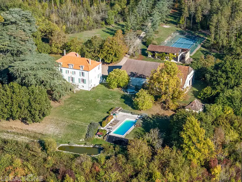 Les extérieurs sont tout aussi remarquables. Le terrain, encadré d’arbres matures, abrite un verger (figuiers, pruniers, pommiers, pêchers, noyers), une petite vigne, deux étangs — dont un alimenté par une source naturelle —, un puits, un pigeonnier traditionnel, ainsi qu’une superbe piscine à débordement de 5x15 mètres offrant une vue imprenable sur la vallée. Un court de tennis complète cet ensemble dédié à la vie au grand air.