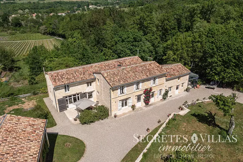 BORDEAUX secteur, plein coeur de l'entre deux mers, de ses vallons et des ses bastides, sur un point culminant SUPERBE PROPRIETE DE CHARME ENTIEREMENT RENOVEE issue d'un ancien domaine viticole avec une vue dominante sur les collines et les vignobles vous offrant une BATISSE PRINCIPALE 246M2: pièce de réception de plus de 70m2 et belle cuisine contemporaine US inox, vaste cellier buanderie, bureau, dressing, 5 chambres dont une suite parentale de 35m2 avec grande sde douche italienne et Wc. 2 Sde. Une ravissante véranda jardin d'hiver d'environ 40m2 dite ' l'orangeraie' vue bois orientée Est parfaire le charme de la bâtisse. Viennent s'ajouter 3 GITES EN ACTIVITE sans vis à vis de charme 100M2 (4 chambre), 87M2 (2 chambres), 37M2 (une chambre), chacun gardant son intimité avec sa terrasse et son jardin .Le site vous permet de vous retrouver au calme tout en gardant une certaine intimité grâce aux trois gîtes indépendants. Piscine 12X4, douche solaire, pool house, boulodrome, terrasses, salle de sport 25m2, cave enterrée, garage-atelier 45m2 viennent compléter cet ensemble. Le tout sur un beau terrain de 5760m2. Reste potentiel constructible. Charme et prestations de qualité avec rénovation des chais et des hangars: murs en pierre centenaires, poutres,chauffage gaz au sol, chaudière Viessman à condensation, chauffe eau thermodynamique, micro station... Ambiance buccolique et sereine à la croisée des chemins entre Bordeaux et les grands crus de Saint Emilion, Sauternes et Pessac Léognan accessibles en 1/2 heure. Aéroport et gare TGV à moins de 40 min. Plages et bassin d'Arcachon et du Cap Ferret à 1 h. IDEAL GRANDE FAMILLE, RESIDENCE SECONDAIRE, AIRBNB, PROFESSION LIBERALE...et pour tous les amoureux de la pierre et de la nature ..DEMANDEZ NOUS LA VIDEO!..Les informations sur les risques auxquels ce bien est exposé sont disponibles sur le site Géorisques (5.05 % honoraires TTC à la charge de l'acquéreur.)