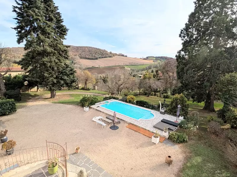 La façade sud s’ouvre sur un parc arboré de plus d’un hectare, largement ensoleillé tout au long de la journée. Un chemin en lacet traverse élégamment le domaine depuis la grille d’entrée et conduit jusqu’au château, créant une approche majestueuse. Une piscine Desjoyaux de 8 × 4 mètres complète cet environnement paisible.