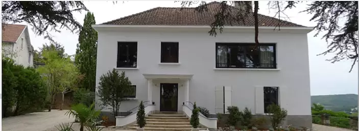 Dans un style art déco avec à l'étage 6 chambres possédant une douche chacune. cuisine, salon de 30 m2 avec marbre et cheminée et salle à manger de 40m2 avec une vue imprenable sur cahors et le parc des cèdres centenaires.