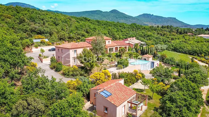 Cette propriété d'exception offre 490 m² habitables et trois espaces de vie distincts, sur un terrain clos et paysagé de 5 000 m², sans aucun vis-à-vis.