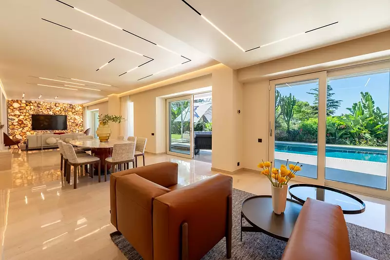 Un 2 pièces indépendant, une salle de sport, un sauna, un hammam, une cave à vin, un grand garage pour 3 véhicules et plusieurs places extérieurs complète la demeure. Le tout sur un terrain plat de 1 800m² arboré et paysagé.