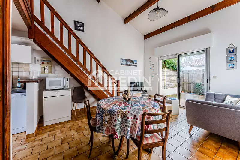 Exclusivité CABINET BEDIN - BISCARROSSE PLAGE. Située dans une petite copropriété de 10 lots, au calme et à proximité immédiate de la plage, cette maison est idéale pour un pied-à-terre ou un investissement locatif. Elle se compose d’un séjour lumineux avec grandes baies vitrées ouvrant sur une terrasse privative d’environ 40 m², d’une cuisine fonctionnelle, de deux chambres de plain-pied, d’une salle d’eau et d’une mezzanine spacieuse permettant d’accueillir plusieurs couchages supplémentaires.