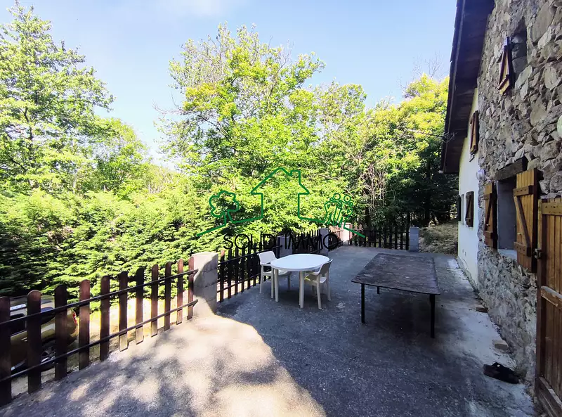 Grange de 50m2 environ sur un grand terrain arboré classé zone naturel avec une source de 9700m2. Se compose d'un séjour cuisine donnant sur une grande terrasse de 48m2, une salle d'eau et un wc. A l’étage, un espace salon-tv et deux pièces en chambres.