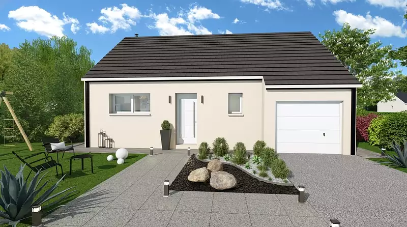 Ce plain-pied deux chambres avec garage intégré se veut évolutif grâce à ses combles aménageables pouvant ajouter 2 autres chambres à l'étage.