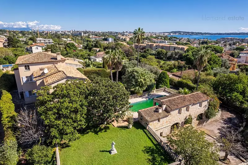 Implantée sur un vaste terrain arboré de 4500 m2, aux essences méditerranéennes, cette propriété unique, construite en 1980, se distingue par son charme et ses nombreuses dépendances. Elle offre une généreuse surface habitable de 500m2 environ , répartie sur plusieurs bâtiments, et bénéficie d’un cadre exceptionnel, propice à la quiétude, et à seulement 2 min en voiture du port de golfe Juan.