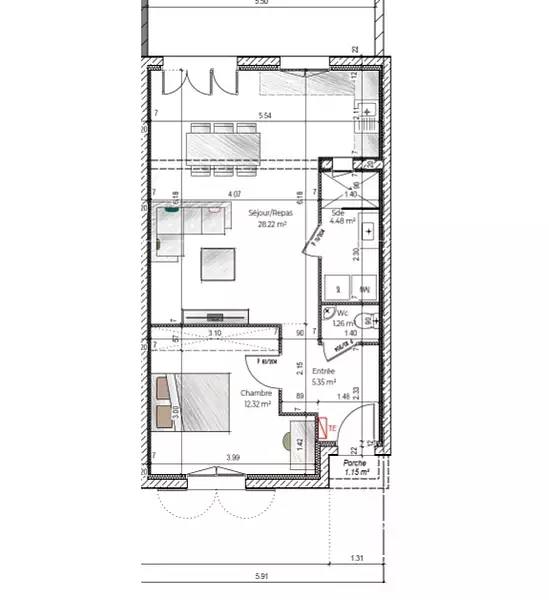 Possibilité d'aménagement avec une entrée, une chambre avec placards, un grand salon + cuisine ouverte, une salle d'eau, un WC indépendant. Petit porche d'accueil.