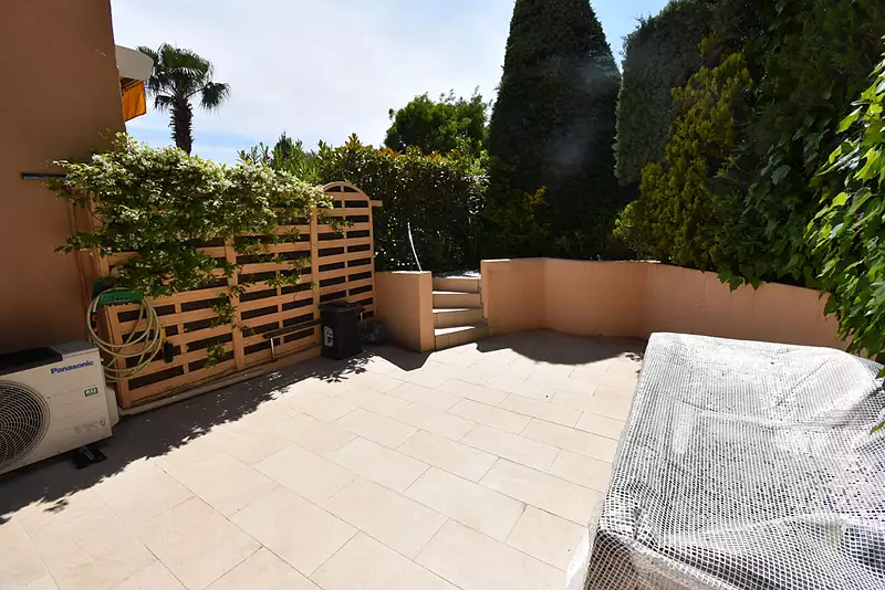 ST RAPHAEL. Bord de mer. Résidence fermée avec piscine. Bastidon de 3 pièces avec grande terrasse sud et parking privé. Situation privilégiée à 50 mètres des plages. Idéal vacances. Excellent état général, belle luminosité. Rénovation récente. Celui-ci se compose d'une entrée, d'un wc d'invités, d'une belle cuisine américaine équipée, d'un salon avec cheminée donnant sur terrasse, d'une chambre de plain pied. Vous trouverez une seconde chambre à l'étage avec salle d'eau et wc. Copropriété de 24 lots (Pas de procédure en cours). Charges annuelles : 1200 euros.